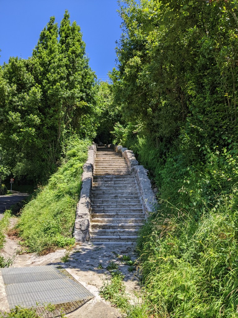 Uphill on paved roads, we followed our digital blue dot and climbed through a residential area. The higher we got, the better the views were. We didn’t see too many people on the road, a few cars, but we kept on climbing the sidewalk until we found a set of stairs.